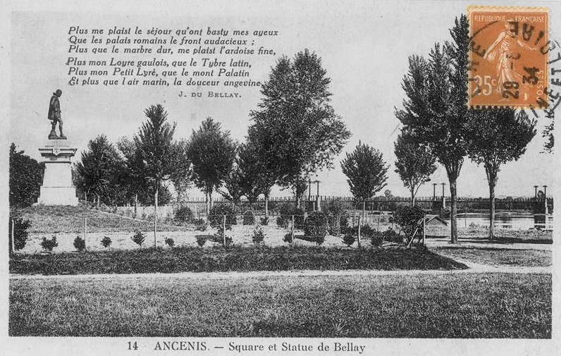 La statue de Joachim du Bellay, oeuvre du sculpteur Léofanti, a été inaugurée le 2 septembre 1894 à Ancenis. Nous devons l’idée de cette création à Léon Séché, homme de lettres angevin, qui avait à coeur de mettre en lumière les grandes figures régionales. Elle se trouvait initialement dans l’actuel parc de l’Eperon, près de la piscine (construite plus tard), sur une butte lui permettant de dominer le parc.