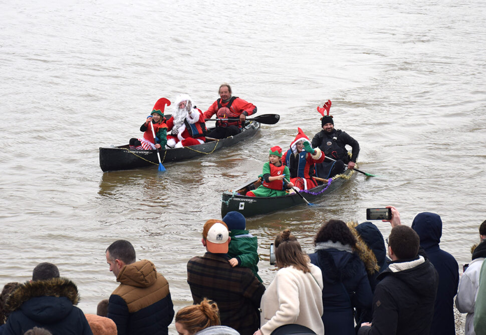 Arrivée du Père Noël sur la Loire et en musique avec le Terminus Brass Band. Distribution de friandises pour les enfants. Vente de vin chaud et chocolat chaud par le Plein Air Ancenien Canoë Kayak.
