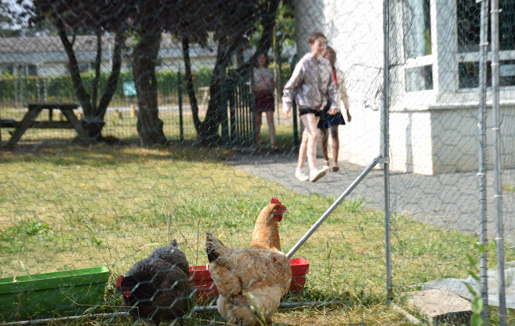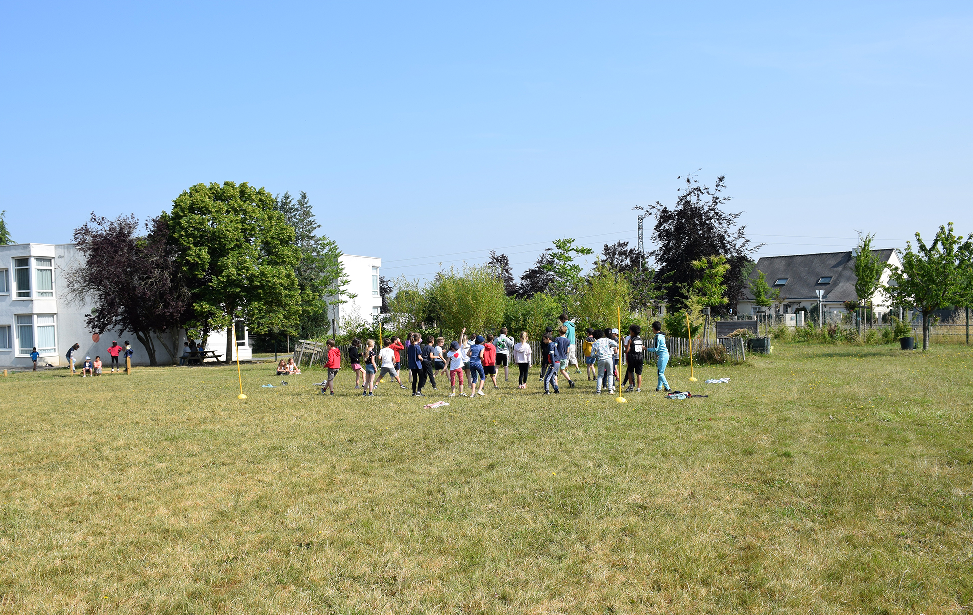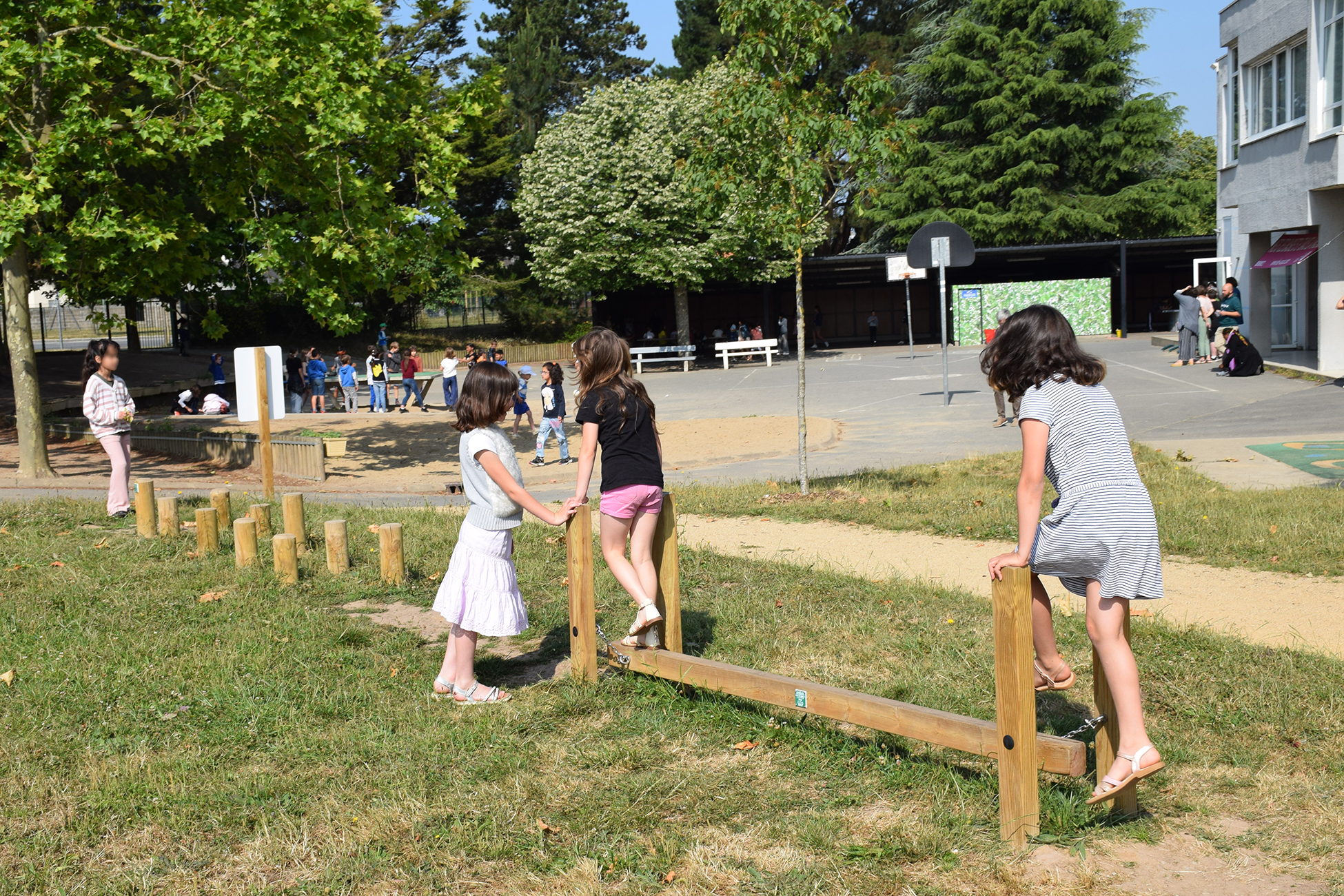 - Un cour végétalisée aménagée avec : un plateau de jeux collectifs, un jardin pédagogique avec des potagers et arbres fruitiers, une zone sportive avec un sautoir et une piste d’élan, un bac à sable, un billodrome, des équipements de motricité (poutre et pas de géants), une plaine enherbée arborée