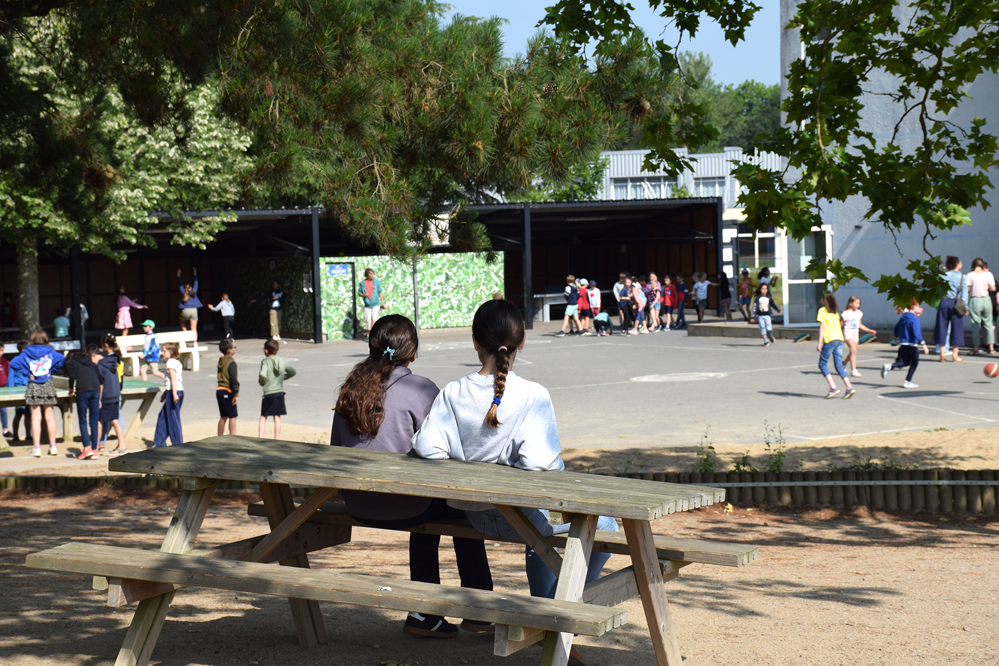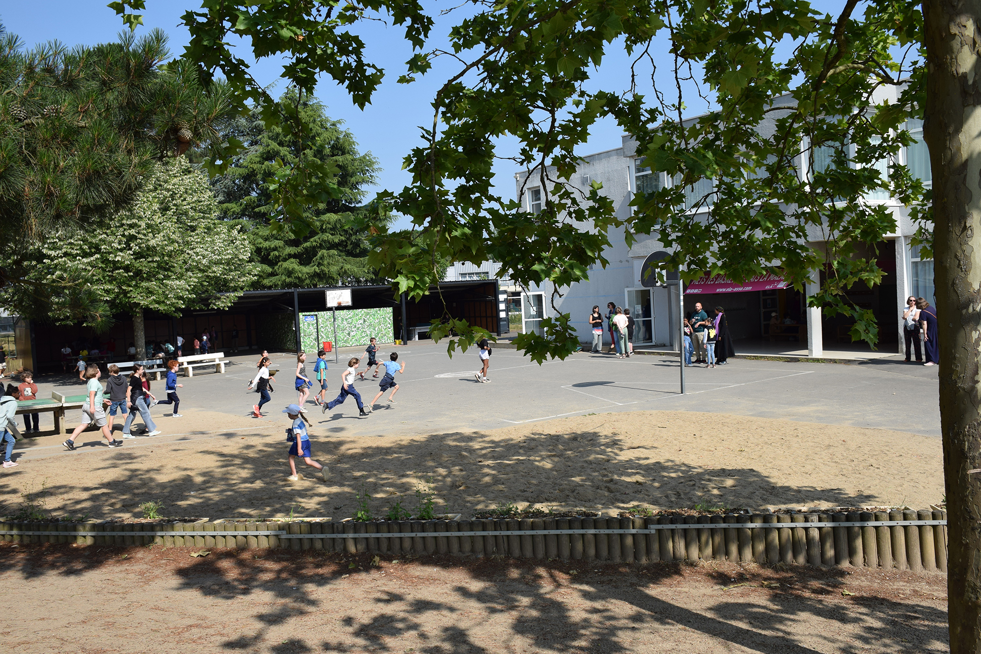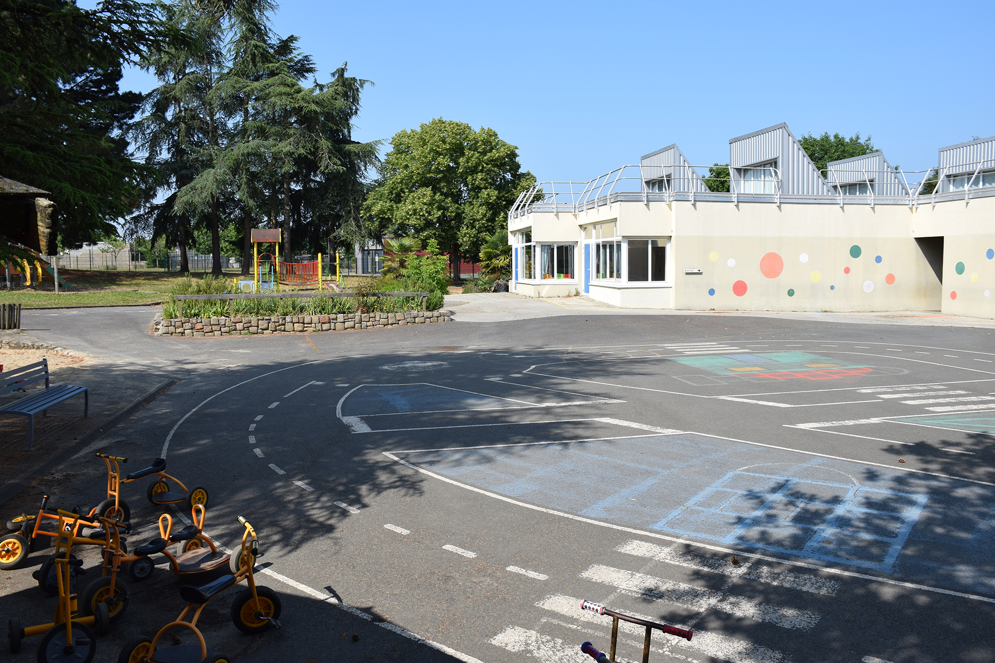 - 1 cour aménagée : parcours de jeux au sol, jardins pédagogiques, bac à sable, structures de jeux extérieurs, une grande prairie enherbée arborée de pins