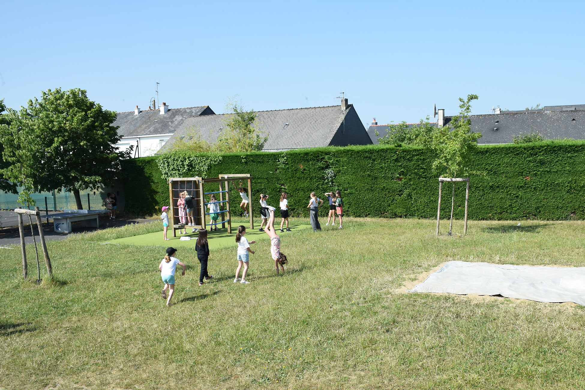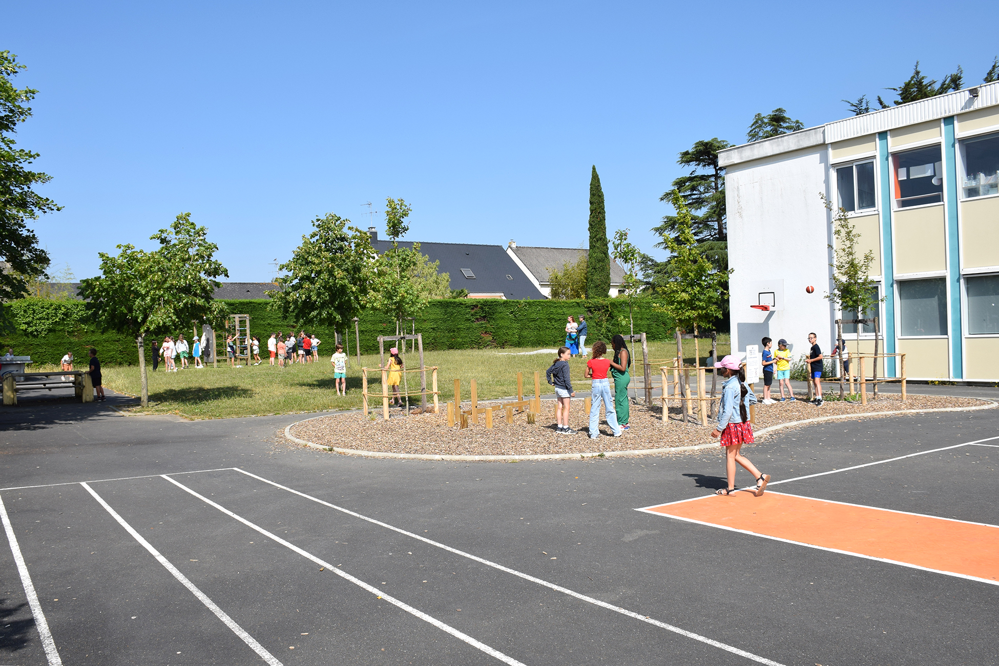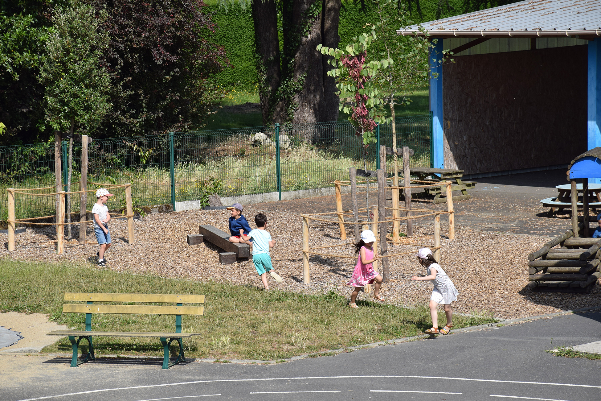 - 1 cour végétalisée aménagée avec : une structure de jeux, 2 équipements de motricité (poutre et pas de géants), des tracés de terrains de jeux collectifs, un espace enherbé avec des jardins pédagogiques, un préau