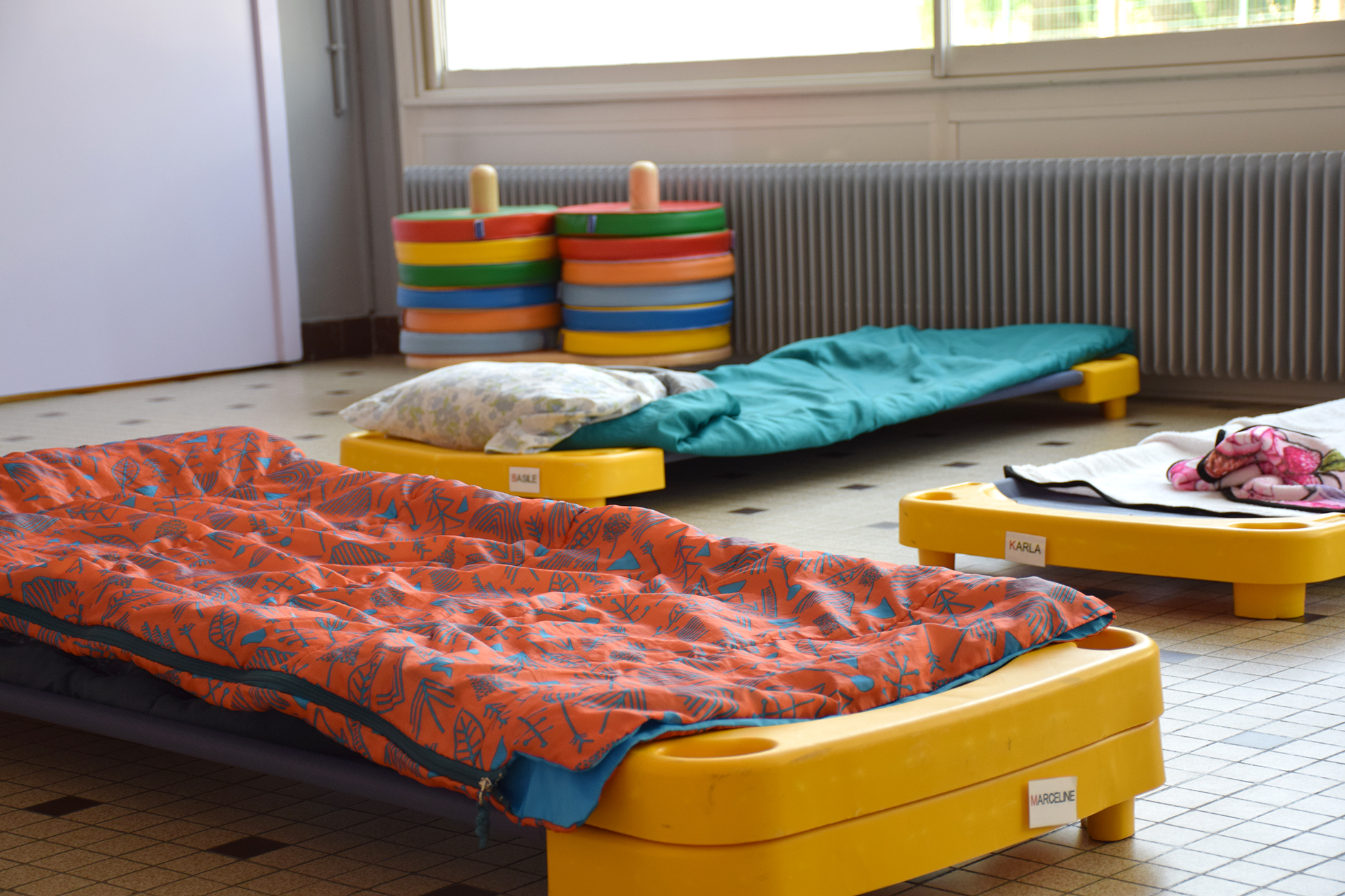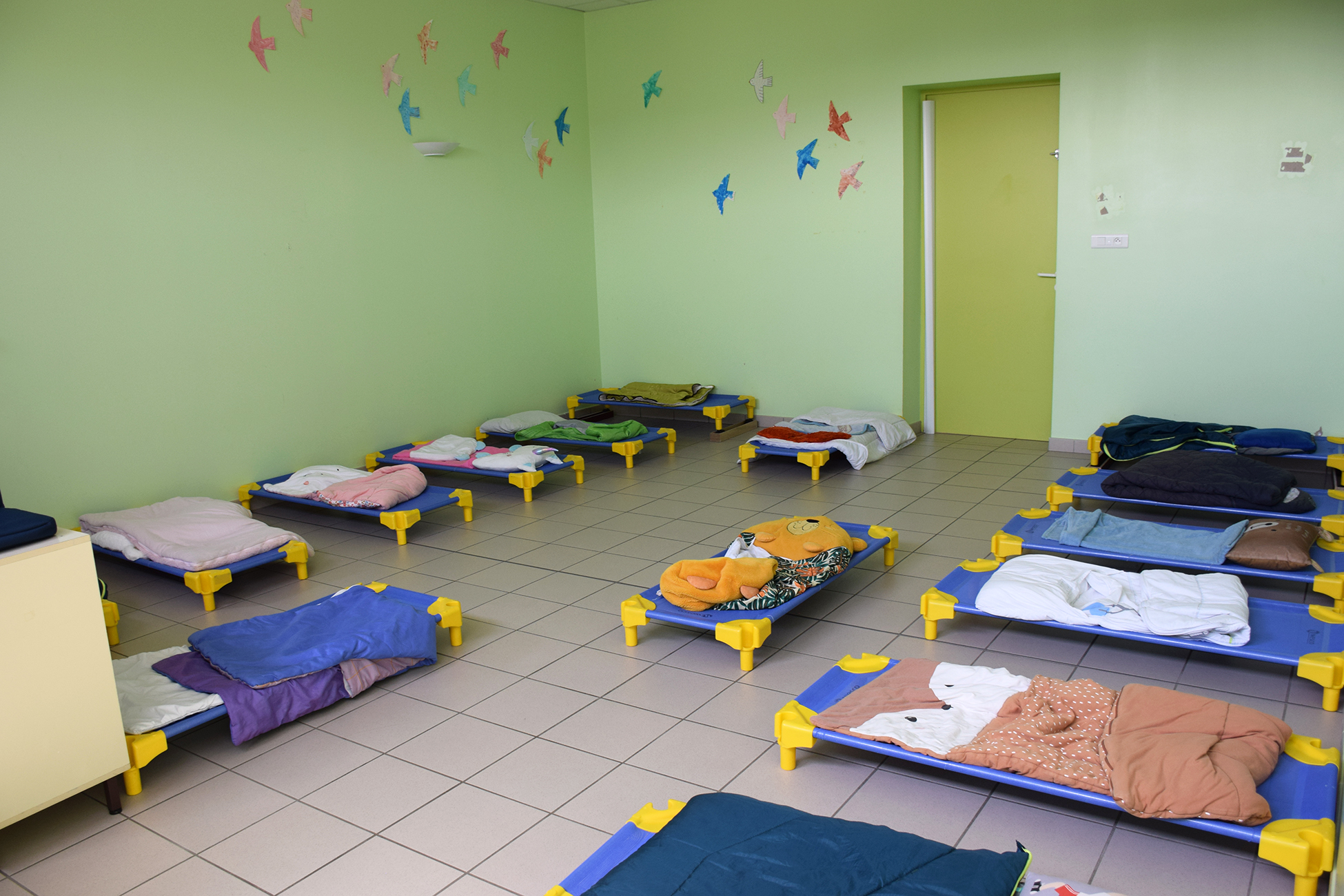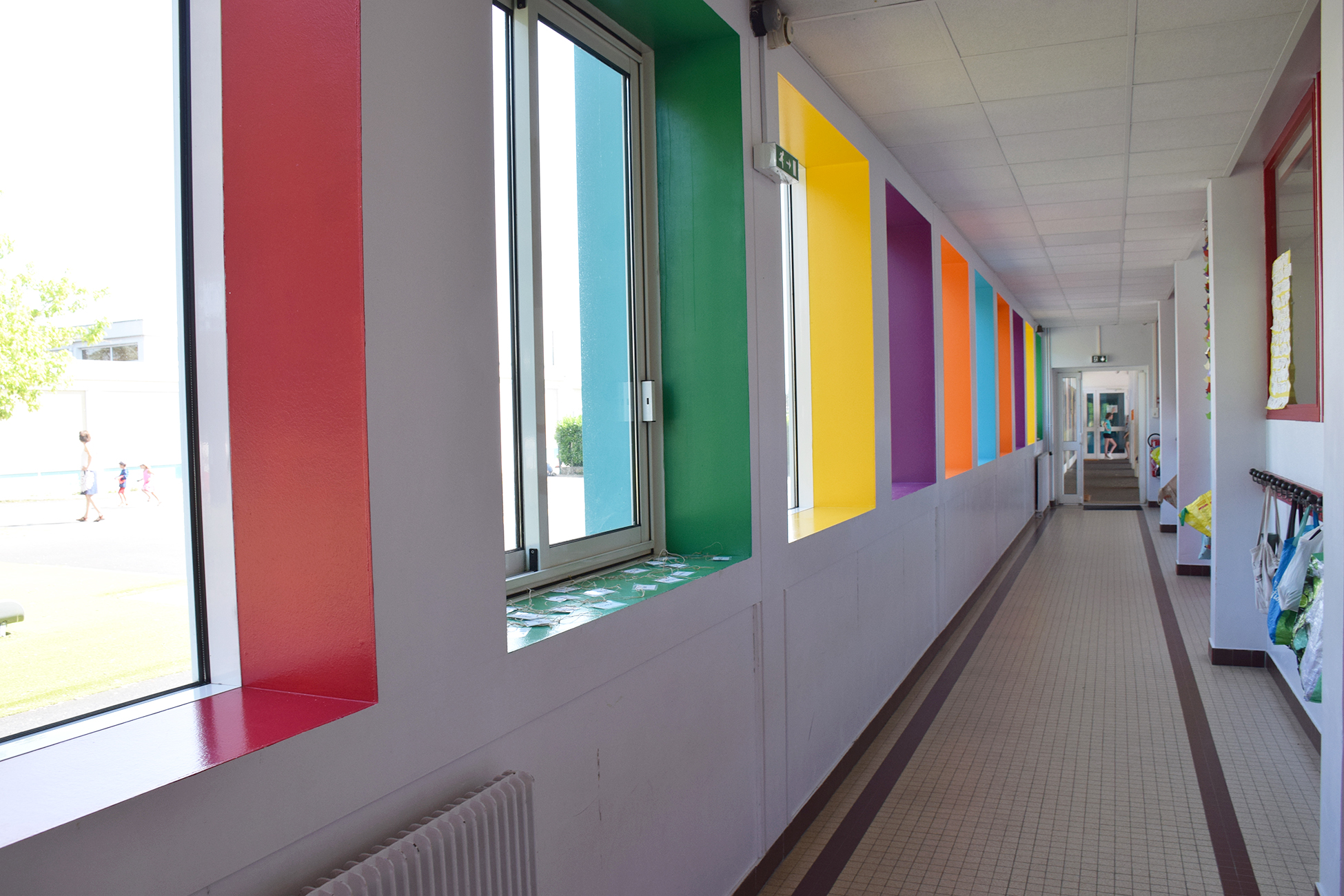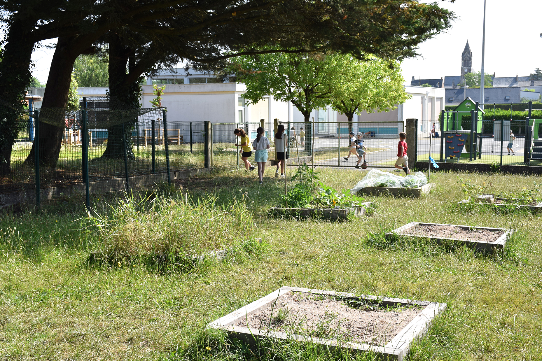 - 1 cour végétalisée aménagée avec : une structure de jeux, 2 équipements de motricité (poutre et pas de géants), des tracés de terrains de jeux collectifs, un espace enherbé avec des jardins pédagogiques, un préau