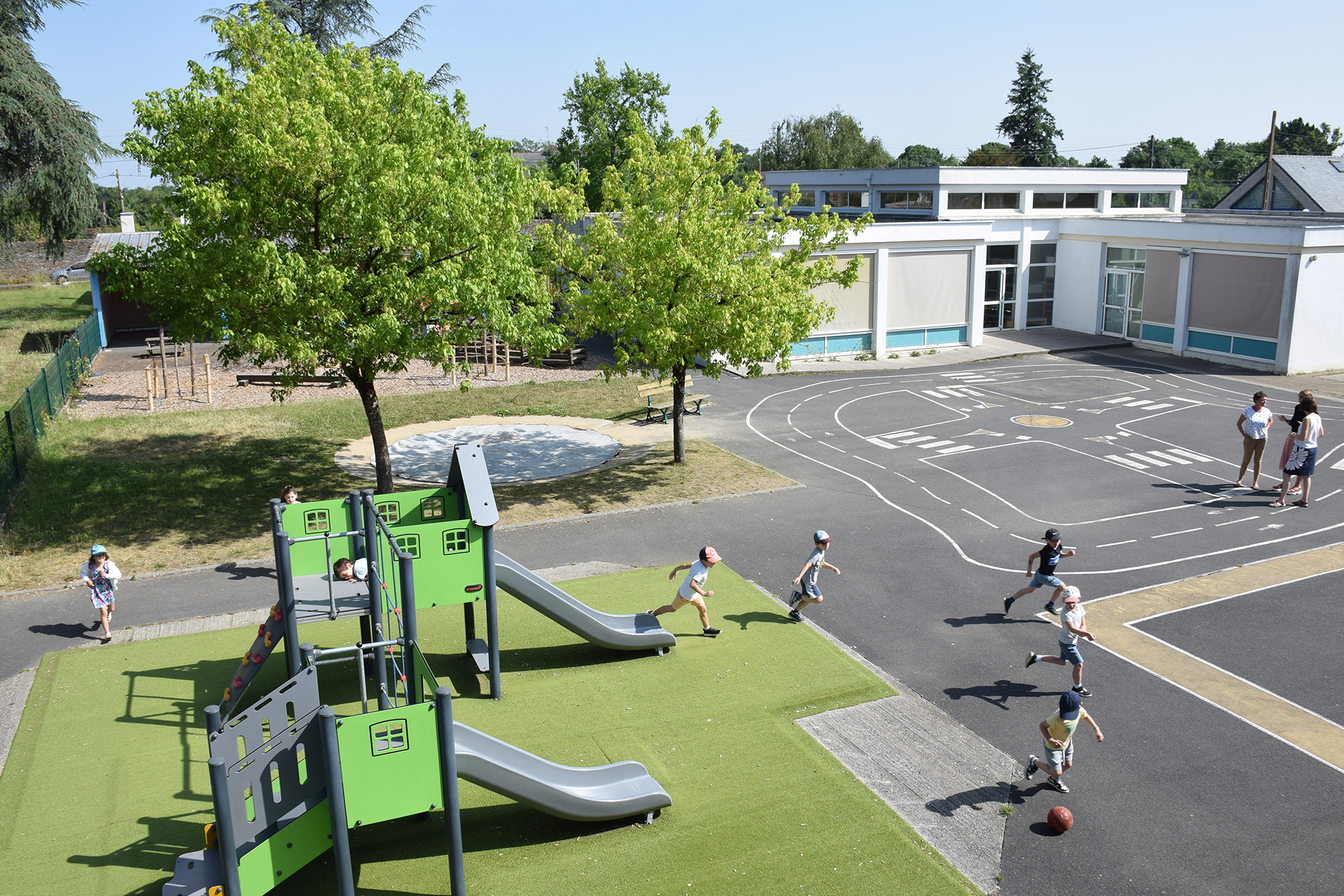 - 1 cour aménagée avec : un bac à sable, des structures de jeux, un espace végétalisé, un préau et des tracés de terrains sportifs ou ludiques au sol.